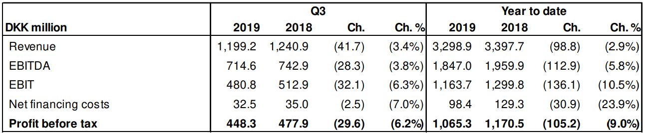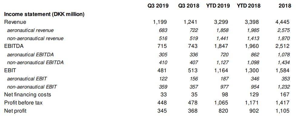 Copenhagen Airports recorded an overall profit before tax of DKK1,0741.1 million for the first nine months of 2019, down -10% on the same period of 2018. The performance was based on revenue of DKK3,298.9 million, representing a -2.9% decrease.