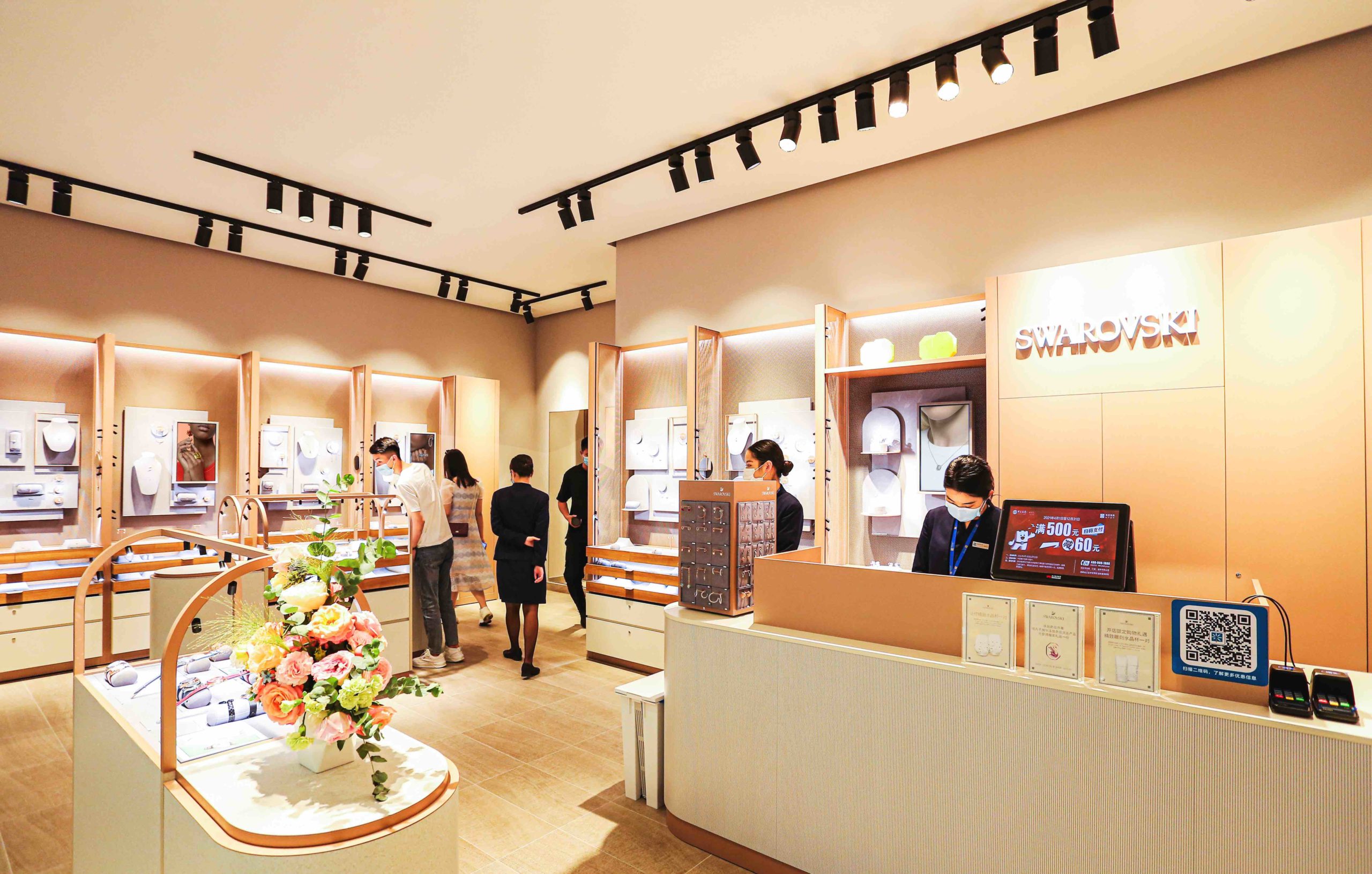 The store features several O2O elements. The physical space highlights the aesthetics of the Swarovski brand while interactive digital features and touchpoints enhance the shopping experience.