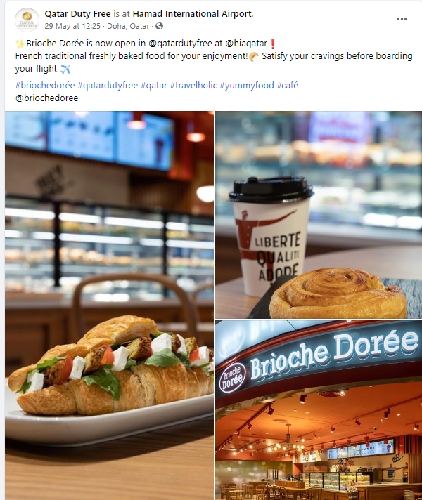 French traditional freshly baked food for your enjoyment! Satisfy your cravings before boarding on your next flight ✈️#briochedorée #qatardutyfree #qatar #travelholic #yummyfood #café pic.twitter.com/DvhVqmiap7— Qatar Duty Free (@qatardutyfree) May 30, 2022