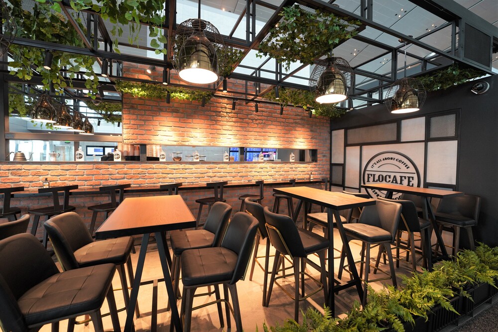 The interior captures the essence of the brand in a vibrant setting with brown and Champagne-coloured walls and ceiling, offset by a check tile floor pattern.