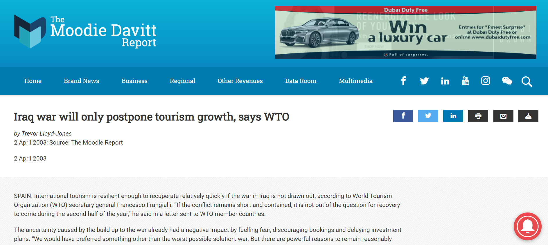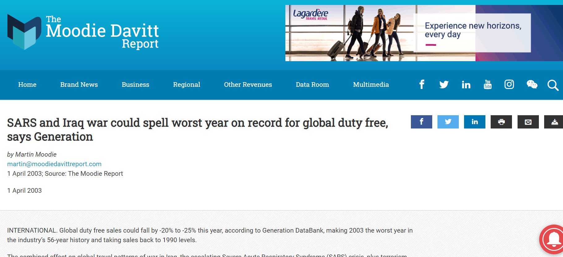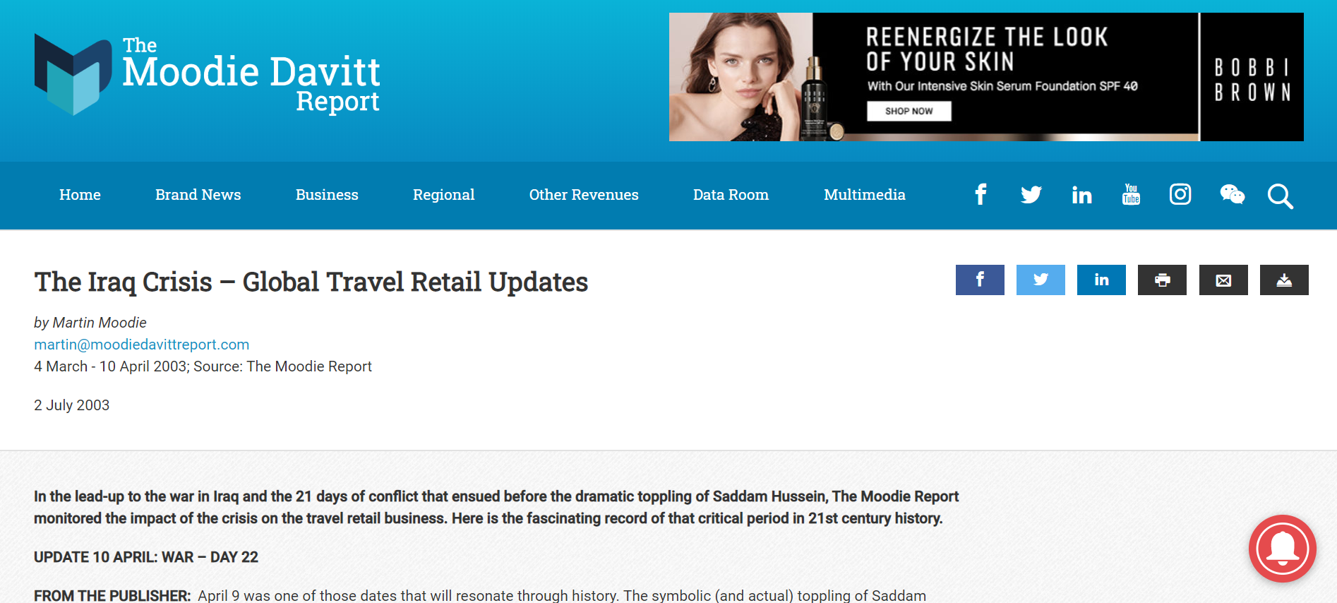 In 2003, history repeated itself, as tourism and passenger numbers were affected around much of the world, a stark period for the travel retail sector. The Moodie Davitt Report, then a fledgling website in its first year, kept the industry updated with a daily update service chronicling the conflict’s severe impact on business.